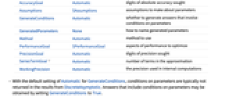 AccuracyGoal Automatic digits of absolute accuracy sought Assumptions $Assumptions assumptions to make about parameters GenerateConditions Automatic whether to generate answers that involve conditions on parameters GeneratedParameters None how to name generated parameters Method Automatic method to use PerformanceGoal $PerformanceGoal aspects of performance to optimize PrecisionGoal Automatic digits of precision sought SeriesTermGoal Automatic number of terms in the approximation WorkingPrecision Automatic the precision used in internal computations - With the default setting of Automatic for GenerateConditions, conditions on parameters are typically not returned in the results from DiscreteAsymptotic. Answers that include conditions on parameters may be obtained by setting GenerateConditions to True.