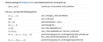 {s1,s2,…,sn} use s1 through sn; then use defaults {{c}} use c in all cases {{c1,c2}} alternate between c1 and c2 {{c1,c2,…}} cycle through all ci {s,{c}} use s, then repeatedly use c {s1,{c},sn} use s1, then repeatedly use c, but use sn at the end {s1,s2,…,{c1,c2,…},sm,…,sn} use the first sequence of si at the beginning, then cyclically use the ci, then use the last sequence of si at the end {s1,s2,…,{},sm,…,sn} use the first sequence of si at the beginning and the last sequence at the end {i1->v1,i2->v2,…} specify what to use at positions ik {spec,rules} use rules to override specifications in spec - The si and ci can be True, False, or an explicit graphics directive.