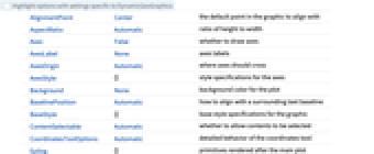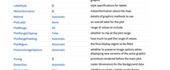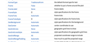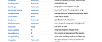 AlignmentPoint Center the default point in the graphic to align with AspectRatio Automatic ratio of height to width Axes False whether to draw axes AxesLabel None axes labels AxesOrigin Automatic where axes should cross AxesStyle {} style specifications for the axes Background None background color for the plot BaselinePosition Automatic how to align with a surrounding text baseline BaseStyle {} base style specifications for the graphic ContentSelectable Automatic whether to allow contents to be selected CoordinatesToolOptions Automatic detailed behavior of the coordinates tool Epilog {} primitives rendered after the main plot FormatType TraditionalForm the default format type for text Frame False whether to put a frame around the plot FrameLabel None frame labels FrameStyle {} style specifications for the frame FrameTicks Automatic frame ticks FrameTicksStyle {} style specifications for frame ticks GeoBackground Automatic style specifications for the background GeoCenter Automatic center coordinates to use GeoGridLines None geographic grid lines to draw GeoGridLinesStyle Automatic style specifications for geographic grid lines GeoGridRange All projected coordinate range to include GeoGridRangePadding Automatic how much to pad the projected range GeoModel Automatic model of the Earth (or other body) to use GeoProjection Automatic projection to use GeoRange Automatic geographic area range to include GeoRangePadding Automatic how much to pad the geographic range GeoResolution Automatic average distance between background pixels GeoScaleBar None scale bar to display GeoServer Automatic specification of a tile server GeoZoomLevel Automatic zoom to use for geographic background GridLines None grid lines to draw GridLinesStyle {} style specifications for grid lines ImageMargins 0. the margins to leave around the graphic ImagePadding All what extra padding to allow for labels etc. ImageSize Automatic the absolute size at which to render the graphic LabelStyle {} style specifications for labels MetaInformation {} metainformation about the map Method Automatic details of graphics methods to use PlotLabel None an overall label for the plot PlotRange All range of values to include PlotRangeClipping False whether to clip at the plot range PlotRangePadding Automatic how much to pad the range of values PlotRegion Automatic the final display region to be filled PreserveImageOptions Automatic whether to preserve image options when displaying new versions of the same graphic Prolog {} primitives rendered before the main plot RasterSize Automatic raster dimensions for the background data RotateLabel True whether to rotate y labels on the frame Ticks Automatic axes ticks TicksStyle {} style specifications for axes ticks