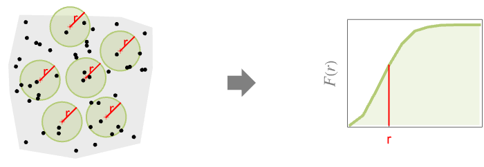 EmptySpaceF is often compared with NearestNeighborG, which estimates the probability of finding another point within distance r from a point in the point collection: