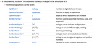 DigitBlock Infinity number of digits between breaks ExponentFunction Automatic function to apply to exponents ExponentStep 3 steps by which exponents can increase NumberFormat Automatic function used to assemble mantissa, base, and exponent NumberMultiplier "×" string to use to indicate multiplication NumberPadding {"",""} strings to use for left and right padding NumberPoint "." decimal point string NumberSeparator {",", " "} string to insert at breaks between blocks NumberSigns {"-",""} strings to use for signs of negative and positive numbers SignPadding False whether to insert padding after the sign - You can mix EngineeringForm and BaseForm.