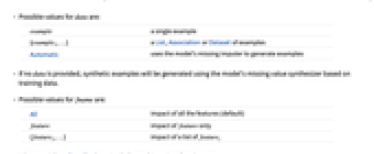 example a single example {example1,…} a List, Association or Dataset of examples Automatic uses the model's missing imputer to generate examples - If no data is provided, synthetic examples will be generated using the model's missing value synthesizer based on training data.