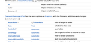 All impact on all the classes (default) name impact on class name only {name1,…} impact on a list of namei - FeatureValueImpactPlot has the same options as Graphics, with the following additions and changes: [List of all options]