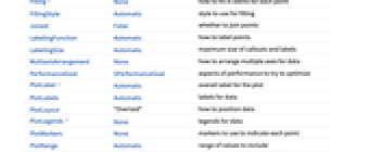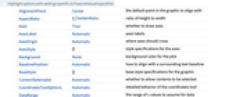 AlignmentPoint Center the default point in the graphic to align with AspectRatio 1/GoldenRatio ratio of height to width Axes True whether to draw axes AxesLabel Automatic axes labels AxesOrigin Automatic where axes should cross AxesStyle {} style specifications for the axes Background None background color for the plot BaselinePosition Automatic how to align with a surrounding text baseline BaseStyle {} base style specifications for the graphic ContentSelectable Automatic whether to allow contents to be selected CoordinatesToolOptions Automatic detailed behavior of the coordinates tool DataRange Automatic the range of x values to assume for data Epilog {} primitives rendered after the main plot Filling None how to fill in stems for each point FillingStyle Automatic style to use for filling FormatType TraditionalForm the default format type for text Frame False whether to put a frame around the plot FrameLabel None frame labels FrameStyle {} style specifications for the frame FrameTicks Automatic frame ticks FrameTicksStyle {} style specifications for frame ticks GridLines None grid lines to draw GridLinesStyle {} style specifications for grid lines ImageMargins 0. the margins to leave around the graphic ImagePadding All what extra padding to allow for labels etc. ImageSize Automatic the absolute size at which to render the graphic IntervalMarkers Automatic how to render uncertainty IntervalMarkersStyle Automatic style for uncertainty elements Joined False whether to join points LabelingFunction Automatic how to label points LabelingSize Automatic maximum size of callouts and labels LabelStyle {} style specifications for labels Method Automatic details of graphics methods to use MultiaxisArrangement None how to arrange multiple axes for data PerformanceGoal $PerformanceGoal aspects of performance to try to optimize PlotLabel Automatic overall label for the plot PlotLabels Automatic labels for data PlotLayout "Overlaid" how to position data PlotLegends None legends for data PlotMarkers None markers to use to indicate each point PlotRange Automatic range of values to include PlotRangeClipping True whether to clip at the plot range PlotRangePadding Automatic how much to pad the range of values PlotRegion Automatic the final display region to be filled PlotStyle Automatic graphics directives to determine styles of points PlotTheme $PlotTheme overall theme for the plot PreserveImageOptions Automatic whether to preserve image options when displaying new versions of the same graphic Prolog {} primitives rendered before the main plot RotateLabel True whether to rotate y labels on the frame ScalingFunctions Automatic how to scale individual coordinates TargetUnits Automatic units to display in the plot Ticks Automatic axes ticks TicksStyle {} style specifications for axes ticks