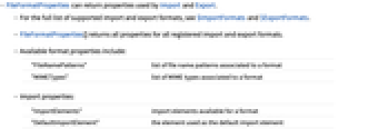- FileFormatProperties[] returns all properties for all registered import and export formats.
