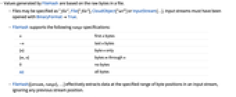n first n bytes -n last n bytes {n} byte n only {m,n} bytes m through n 0 no bytes All all bytes - FileHash[{stream,range},…] effectively extracts data at the specified range of byte positions in an input stream, ignoring any previous stream position.