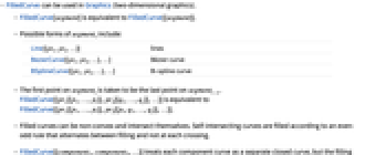 Line[{pt1,pt2,…}] lines BezierCurve[{pt1,pt2,…},…] Bézier curve BSplineCurve[{pt1,pt2,…},…] B-spline curve - The first point on segmenti is taken to be the last point on segmenti-1. FilledCurve[{pr1[{p1,…,pi}],pr2[{q1,…,qj}],…}] is equivalent to FilledCurve[{pr1[{p1,…,pi}],pr2[{pi,q1,…,qj}],…}].