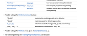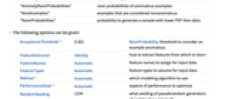 AcceptanceThreshold 0.001 RarerProbability threshold to consider an example anomalous FeatureExtractor Identity how to extract features from which to learn FeatureNames Automatic feature names to assign for input data FeatureTypes Automatic feature types to assume for input data Method Automatic which modeling algorithm to use PerformanceGoal Automatic aspects of performance to optimize RandomSeeding 1234 what seeding of pseudorandom generators should be done internally TimeGoal Automatic how long to spend training the detector TrainingProgressReporting Automatic how to report progress during training ValidationSet Automatic the set of data on which to evaluate the model during training - Possible settings for PerformanceGoal include: