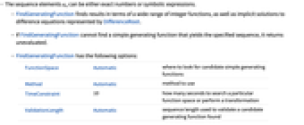 FunctionSpace Automatic where to look for candidate simple generating functions Method Automatic method to use TimeConstraint 10 how many seconds to search a particular function space or perform a transformation ValidationLength Automatic sequence length used to validate a candidate generating function found - FindGeneratingFunction[list,x] by default uses earlier elements in list to find candidate simple generating functions, then validates the generating functions by looking at later elements.