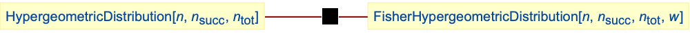 - FisherHypergeometricDistribution is related to a number of other statistical distributions. As mentioned above, there is a fundamental link between FisherHypergeometricDistribution, WalleniusHypergeometricDistribution, and HypergeometricDistribution. The latter relationship can be made quantitatively precise by noting that FisherHypergeometricDistribution[n,nsucc,ntot,1] has the same PDF as HypergeometricDistribution[n,nsucc,ntot]. In addition, FisherHypergeometricDistribution can be obtained from two independent samples distributed according to BinomialDistribution by conditioning on their total.