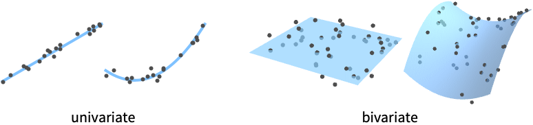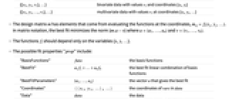 {v1,…,vn} equivalent to {{1,v1},…,{n,vn}} {{x1,v1},…,{xn,vn}} univariate data with values vi at coordinates xi {{x1,y1,v1},…} bivariate data with values vi and coordinates {xi,yi} {{x1,y1,…,v1},…} multivariate data with values vi at coordinates {xi,yi,…} - The design matrix m has elements that come from evaluating the functions at the coordinates,