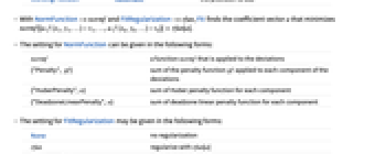 normf a function normf that is applied to the deviations {"Penalty", pf} sum of the penalty function pf applied to each component of the deviations {"HuberPenalty",α} sum of Huber penalty function for each component {"DeadzoneLinearPenalty",α} sum of deadzone linear penalty function for each component - The setting for FitRegularization may be given in the following forms: