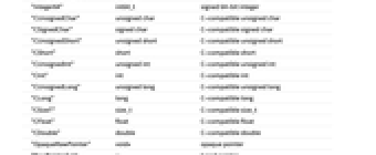 "UnsignedInteger8" uint8_t unsigned 8-bit integer "Integer8" int8_t signed 8-bit integer "UnsignedInteger16" uint16_t unsigned 16-bit integer "Integer16" int16_t signed 16-bit integer "UnsignedInteger32" uint32_t unsigned 32-bit integer "Integer32" int32_t signed 32-bit integer "UnsignedInteger64" uint64_t unsigned 64-bit integer "Integer64" int64_t signed 64-bit integer "CUnsignedChar" unsigned char C-compatible unsigned char "CSignedChar" signed char C-compatible signed char "CUnsignedShort" unsigned short C-compatible unsigned short "CShort" short C-compatible short "CUnsignedInt" unsigned int C-compatible unsigned int "CInt" int C-compatible int "CUnsignedLong" unsigned long C-compatible unsigned long "CLong" long C-compatible long "CSizeT" size_t C-compatible size_t "CFloat" float C-compatible float "CDouble" double C-compatible double "OpaqueRawPointer" void* opaque pointer "RawPointer"::[t] t* typed pointer {ty1,ty2,…} struct {ty1 f1; ty2 f2; …} struct or product type "Void" void no output (only in output types) - Struct or product types can also be written as "ListTuple"::[ty1,ty2, …].