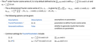 Assumptions $Assumptions assumptions on parameters FourierParameters {1,1} parameters to define Fourier cosine series GenerateConditions False whether to generate results that involve conditions on parameters - Common settings for FourierParameters include: