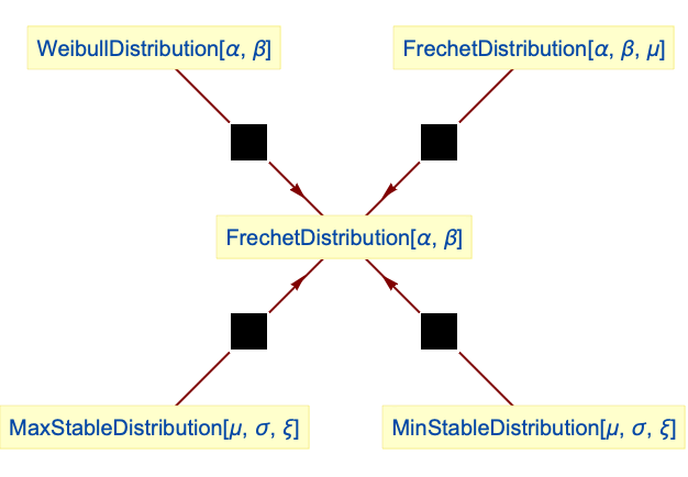 - The Fréchet distribution is related to several other distributions. As mentioned previously, FrechetDistribution shares qualitative relationships with ExtremeValueDistribution, GumbelDistribution, and WeibullDistribution. These relationships can be quantified by noting that the PDF of FrechetDistribution[α,β] is precisely the same as TransformedDistribution[β2/z,zWeibullDistribution[α,β]], and that WeibullDistribution can be written as transformed versions of both ExtremeValueDistribution and GumbelDistribution. The PDF of FrechetDistribution[α,β] is the same as MaxStableDistribution[β,β/α,1/α] and MinStableDistribution[-β,β/α,1/α] under suitable transformations and assumptions and can be obtained from UniformDistribution under a suitable chain of transformations. FrechetDistribution is also related to ExpGammaDistribution, ExponentialDistribution, and LogisticDistribution.