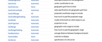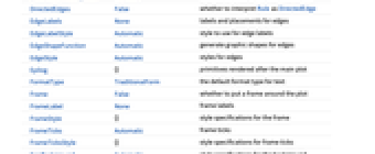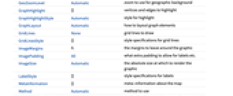 AlignmentPoint Center the default point in the graphic to align with AnnotationRules {} annotations for graph, edges and vertices AspectRatio Automatic ratio of height to width Axes False whether to draw axes AxesLabel None axes labels AxesOrigin Automatic where axes should cross AxesStyle {} style specifications for the axes Background None background color for the plot BaselinePosition Automatic how to align with a surrounding text baseline BaseStyle {} base style specifications for the graphic ContentSelectable Automatic whether to allow contents to be selected CoordinatesToolOptions Automatic detailed behavior of the coordinates tool DirectedEdges False whether to interpret Rule as DirectedEdge EdgeLabels None labels and placements for edges EdgeLabelStyle Automatic style to use for edge labels EdgeShapeFunction Automatic generate graphic shapes for edges EdgeStyle Automatic styles for edges Epilog {} primitives rendered after the main plot FormatType TraditionalForm the default format type for text Frame False whether to put a frame around the plot FrameLabel None frame labels FrameStyle {} style specifications for the frame FrameTicks Automatic frame ticks FrameTicksStyle {} style specifications for frame ticks GeoBackground Automatic style specifications for the background GeoCenter Automatic center coordinates to use GeoGridLines None geographic grid lines to draw GeoGridLinesStyle Automatic style specifications for geographic grid lines GeoGridRange All projected coordinate range to include GeoGridRangePadding Automatic how much to pad the projected range GeoModel Automatic model of the Earth (or other body) to use GeoProjection Automatic projection to use GeoRange Automatic geographic area range to include GeoRangePadding Automatic how much to pad the geographic range GeoResolution Automatic average distance between background pixels GeoScaleBar None scale bar to display GeoServer Automatic specification of a tile server GeoZoomLevel Automatic zoom to use for geographic background GraphHighlight {} vertices and edges to highlight GraphHighlightStyle Automatic style for highlight GraphLayout Automatic how to layout graph elements GridLines None grid lines to draw GridLinesStyle {} style specifications for grid lines ImageMargins 0. the margins to leave around the graphic ImagePadding All what extra padding to allow for labels etc. ImageSize Automatic the absolute size at which to render the graphic LabelStyle {} style specifications for labels MetaInformation {} meta-information about the map Method Automatic method to use PerformanceGoal Automatic aspects of performance to try to optimize PlotLabel None an overall label for the plot PlotRange All range of values to include PlotRangeClipping False whether to clip at the plot range PlotRangePadding Automatic how much to pad the range of values PlotRegion Automatic the final display region to be filled PlotStyle Automatic graphics directives to determine styles PlotTheme Automatic overall theme for the graph PreserveImageOptions Automatic whether to preserve image options when displaying new versions of the same graphic Prolog {} primitives rendered before the main plot RasterSize Automatic raster dimensions for the background data RotateLabel True whether to rotate y labels on the frame Ticks Automatic axes ticks TicksStyle {} style specifications for axes ticks VertexCoordinates Automatic coordinates for vertices VertexLabels None labels and placements for vertices VertexLabelStyle Automatic style to use for vertex labels VertexShape Automatic graphic shape for vertices VertexShapeFunction Automatic generate graphic shapes for vertices VertexSize Automatic size of vertices VertexStyle Automatic styles for vertices