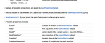 "Count" number of vectors in the GeoGridVector object "Data" first argument of the GeoGridVector object "Depth" vector depth: 0 for a single vector, 1 for a list of them, … "GeoProjection" geo projection of the GeoGridVector object "Location" location data of the GeoGridVector object "LocationDimension" number of coordinates for each position "LocationPackingType" Integer or Real if positions are packed; None otherwise "Vector" vector data of the GeoGridVector object "VectorDimension" number of components for each vector "VectorPackingType" Integer or Real if vectors are packed; None otherwise