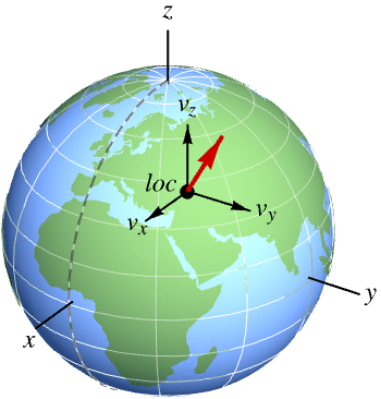 represents a three-dimensional vector of Cartesian components vX, vY, vZ in an orthonormal frame parallel to the geocentric frame, at location loc.