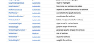 AnnotationRules {} annotations for graph, edges and vertices Boxed False whether to draw edges of the bounding box DirectedEdges Automatic whether to interpret Rule as DirectedEdge EdgeLabels Automatic labels and placements for edges EdgeLabelStyle Automatic style to use for edge labels EdgeShapeFunction Automatic generate graphic shapes for edges EdgeStyle Automatic styles for edges EdgeWeight Automatic weights for edges GraphHighlight {} graph elements to highlight GraphHighlightStyle Automatic style for highlight GraphLayout Automatic how to lay out vertices and edges PerformanceGoal Automatic aspects of performance to try to optimize PlotTheme Automatic overall style for graph elements VertexCoordinates Automatic coordinates for vertices VertexLabels Automatic labels and placements for vertices VertexLabelStyle Automatic style to use for vertex labels VertexShape Automatic graphic shape for vertices VertexShapeFunction Automatic generate graphic shapes for vertices VertexSize Medium size of vertices VertexStyle Automatic styles for vertices VertexWeight Automatic weights for vertices -