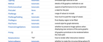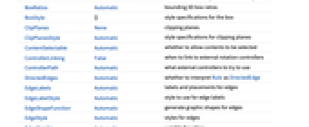 AlignmentPoint Center the default point in the graphic to align with AnnotationRules {} annotations for graph, edges and vertices AspectRatio Automatic ratio of height to width Axes False whether to draw axes AxesEdge Automatic on which edges to put axes AxesLabel None axes labels AxesOrigin Automatic where axes should cross AxesStyle {} graphics directives to specify the style for axes Background None background color for the plot BaselinePosition Automatic how to align with a surrounding text baseline BaseStyle {} base style specifications for the graphic Boxed False whether to draw edges of the bounding box BoxRatios Automatic bounding 3D box ratios BoxStyle {} style specifications for the box ClipPlanes None clipping planes ClipPlanesStyle Automatic style specifications for clipping planes ContentSelectable Automatic whether to allow contents to be selected ControllerLinking False when to link to external rotation controllers ControllerPath Automatic what external controllers to try to use DirectedEdges Automatic whether to interpret Rule as DirectedEdge EdgeLabels Automatic labels and placements for edges EdgeLabelStyle Automatic style to use for edge labels EdgeShapeFunction Automatic generate graphic shapes for edges EdgeStyle Automatic styles for edges EdgeWeight Automatic weights for edges Epilog {} 2D graphics primitives to be rendered after the main plot FaceGrids None grid lines to draw on the bounding box FaceGridsStyle {} style specifications for face grids FormatType TraditionalForm default format type for text GraphHighlight {} graph elements to highlight GraphHighlightStyle Automatic style for highlight GraphLayout Automatic how to lay out vertices and edges ImageMargins 0. the margins to leave around the graphic ImagePadding All what extra padding to allow for labels, etc. ImageSize Automatic absolute size at which to render the graphic LabelStyle {} style specifications for labels Lighting Automatic simulated light sources to use Method Automatic details of 3D graphics methods to use PerformanceGoal Automatic aspects of performance to try to optimize PlotLabel None a label for the plot PlotRange All range of values to include PlotRangePadding Automatic how much to pad the range of values PlotRegion Automatic final display region to be filled PlotTheme Automatic overall style for graph elements PreserveImageOptions Automatic whether to preserve image options when displaying new versions of the same graphic Prolog {} 2D graphics primitives to be rendered before the main plot RotationAction "Fit" how to render after interactive rotation SphericalRegion Automatic whether to make the circumscribing sphere fit in the final display area Ticks Automatic specification for ticks TicksStyle {} style specification for ticks TouchscreenAutoZoom False whether to zoom to fullscreen when activated on a touchscreen VertexCoordinates Automatic coordinates for vertices VertexLabels Automatic labels and placements for vertices VertexLabelStyle Automatic style to use for vertex labels VertexShape Automatic graphic shape for vertices VertexShapeFunction Automatic generate graphic shapes for vertices VertexSize Medium size of vertices VertexStyle Automatic styles for vertices VertexWeight Automatic weights for vertices ViewAngle Automatic angle of the field of view ViewCenter Automatic point to display at the center ViewMatrix Automatic explicit transformation matrix ViewPoint {1.3,-2.4,2.} viewing position ViewProjection Automatic projection method for rendering objects distant from the viewer ViewRange All range of viewing distances to include ViewVector Automatic position and direction of a simulated camera ViewVertical {0,0,1} direction to make vertical