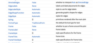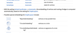 DataRange Automatic the range of vertex coordinates to generate DirectedEdges False whether to interpret Rule as DirectedEdge EdgeLabels None labels and label placements for edges EdgeLabelStyle Automatic style to use for edge labels EdgeShapeFunction Automatic generate graphic shapes for edges EdgeStyle Automatic styles for edges GraphLayout Automatic how to lay out vertices and edges GraphHighlight {} vertices and edges to highlight GraphHighlightStyle Automatic style for highlight Method Automatic method to use PerformanceGoal Automatic aspects of performance to try to optimize PlotStyle Automatic graphics directives to determine styles PlotTheme Automatic overall theme for the graph VertexCoordinates Automatic coordinates for vertices VertexLabels None labels and label placements for vertices VertexLabelStyle Automatic style to use for vertex labels VertexShape Automatic graphic shape for vertices VertexShapeFunction Automatic generate graphic shapes for vertices VertexSize Automatic size of vertices VertexStyle Automatic styles for vertices - With the setting VertexCoordinates->Automatic, the embedding of vertices and routing of edges is computed automatically, based on the setting for GraphLayout.