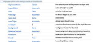 AlignmentPoint Center the default point in the graphic to align with AspectRatio Automatic ratio of height to width Axes False whether to draw axes AxesEdge Automatic on which edges to put axes AxesLabel None axes labels AxesOrigin Automatic where axes should cross AxesStyle {} graphics directives to specify the style for axes Background None background color for the plot BaselinePosition Automatic how to align with a surrounding text baseline BaseStyle {} base style specifications for the graphic Boxed True whether to draw the bounding box BoxRatios Automatic bounding 3D box ratios BoxStyle {} style specifications for the box ClipPlanes None clipping planes ClipPlanesStyle Automatic style specifications for clipping planes ContentSelectable Automatic whether to allow contents to be selected ControllerLinking False when to link to external rotation controllers ControllerPath Automatic what external controllers to try to use DataRange Automatic the range of vertex coordinates to generate DirectedEdges False whether to interpret Rule as DirectedEdge EdgeLabels None labels and placements for edges EdgeLabelStyle Automatic style to use for edge labels EdgeShapeFunction Automatic generate graphic shapes for edges EdgeStyle Automatic styles for edges Epilog {} 2D graphics primitives to be rendered after the main plot FaceGrids None grid lines to draw on the bounding box FaceGridsStyle {} style specifications for face grids FormatType TraditionalForm default format type for text GraphHighlight {} vertices and edges to highlight GraphHighlightStyle Automatic style for highlight GraphLayout Automatic how to lay out vertices and edges ImageMargins 0. the margins to leave around the graphic ImagePadding All what extra padding to allow for labels, etc. ImageSize Automatic absolute size at which to render the graphic LabelStyle {} style specifications for labels Lighting Automatic simulated light sources to use Method Automatic method to use PerformanceGoal Automatic aspects of performance to try to optimize PlotLabel None a label for the plot PlotRange All range of values to include PlotRangePadding Automatic how much to pad the range of values PlotRegion Automatic final display region to be filled PlotStyle Automatic graphics directives to determine styles PlotTheme Automatic overall theme for the graph PreserveImageOptions Automatic whether to preserve image options when displaying new versions of the same graphic Prolog {} 2D graphics primitives to be rendered before the main plot RotationAction "Fit" how to render after interactive rotation SphericalRegion Automatic whether to make the circumscribing sphere fit in the final display area Ticks Automatic specification for ticks TicksStyle {} style specification for ticks TouchscreenAutoZoom False whether to zoom to fullscreen when activated on a touchscreen VertexCoordinates Automatic coordinates for vertices VertexLabels None labels and placements for vertices VertexLabelStyle Automatic style to use for vertex labels VertexShape Automatic graphic shape for vertices VertexShapeFunction Automatic generate graphic shapes for vertices VertexSize Automatic size of vertices VertexStyle Automatic styles for vertices ViewAngle Automatic angle of the field of view ViewCenter Automatic point to display at the center ViewMatrix Automatic explicit transformation matrix ViewPoint {1.3,-2.4,2.} viewing position ViewProjection Automatic projection method for rendering objects distant from the viewer ViewRange All range of viewing distances to include ViewVector Automatic position and direction of a simulated camera ViewVertical {0,0,1} direction to make vertical
