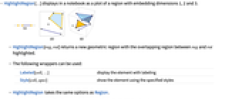 - HighlightRegion[…] displays in a notebook as a plot of a region with embedding dimensions 1, 2 and 3.