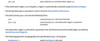 proc a point process proc with exact formulas {proc,reg} a point process proc and observation region reg based on simulation - The observation region reg should be a parameter-free, full-dimensional and bounded region as tested by SpatialObservationRegionQ.