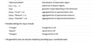 shape geometric shape depending on the dimension {shape,"Count"n} aggregated bins to approximately n bins {shape,"Measure"ν} aggregated bins of approximate measure ν {shape,"Diameter"d} aggregated bins of approximate diameter d - Possible settings for shape include: