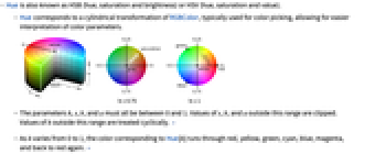 - Hue corresponds to a cylindrical transformation of RGBColor, typically used for color picking, allowing for easier interpretation of color parameters.