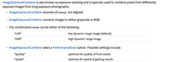 "LDR" low dynamic range image (default) "HDR" high dynamic range image - ImageExposureCombine takes a PerformanceGoal option. Possible settings include: