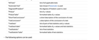 "AllTests" list of all applicable tests "AutomaticTest" test chosen if Automatic is used "DegreesOfFreedom" the degrees of freedom used in a test "PValue" list of