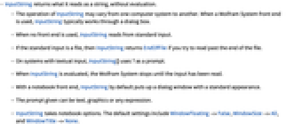 - The operation of InputString may vary from one computer system to another. When a Wolfram System front end is used, InputString typically works through a dialog box.