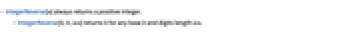 - IntegerReverse[0,b,len] returns 0 for any base b and digits length len.