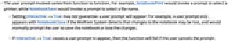 - Setting Interactive->True may not guarantee a user prompt will appear. For example, a user prompt only appears with NotebookClose if the Wolfram System detects that changes to the notebook may be lost, and would normally prompt the user to save the notebook or lose the changes.