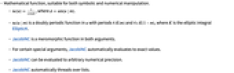 is the elliptic integral EllipticK.- JacobiNC is a meromorphic function in both arguments.