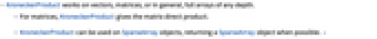 - KroneckerProduct works on vectors, matrices, or in general, full arrays of any depth.