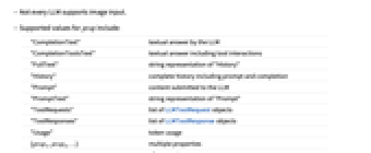 "CompletionText" textual answer by the LLM "CompletionToolsText" textual answer including tool interactions "FullText" string representation of "History" "History" complete history including prompt and completion "Prompt" content submitted to the LLM "PromptText" string representation of "Prompt" "ToolRequests" list of LLMToolRequest objects "ToolResponses" list of LLMToolResponse objects "Usage" token usage {prop1,prop2,…} multiple properties All all properties - "FullTextAnnotations", "ToolRequests" and "ToolResponses" give associations with elements in the format {start,end}val, where val refers to an object and start and end refer to the span of characters where val is specified in "FullText".