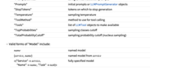 "MaxTokens" maximum amount of tokens to generate "Model" base model "PromptDelimiter" string to insert between prompts "Prompts" initial prompts or LLMPromptGenerator objects "StopTokens" tokens on which to stop generation "Temperature" sampling temperature "ToolMethod" method to use for tool calling "Tools" list of LLMTool objects to make available "TopProbabilities" sampling classes cutoff "TotalProbabilityCutoff" sampling probability cutoff (nucleus sampling) - Valid forms of "Model" include: