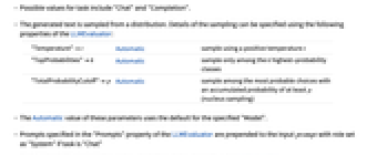 "Temperature"t Automatic sample using a positive temperature t "TopProbabilities"k Automatic sample only among the k highest-probability classes "TotalProbabilityCutoff"p Automatic sample among the most probable choices with an accumulated probability of at least p (nucleus sampling) - The Automatic value of these parameters uses the default for the specified "Model".