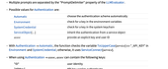 Automatic choose the authentication scheme automatically Environment check for a key in the environment variables SystemCredential check for a key in the system keychain ServiceObject[…] inherit the authentication from a service object assoc provide an explicit key and user ID - With AuthenticationAutomatic, the function checks the variable ToUpperCase[service]<>"_API_KEY" in Environment and SystemCredential; otherwise, it uses ServiceConnect[service].