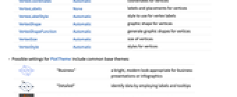 DataRange Automatic the range of vertex coordinates to generate DirectedEdges Automatic whether to interpret Rule as DirectedEdge EdgeLabels None labels and placements for edges EdgeLabelStyle Automatic style to use for edge labels EdgeShapeFunction Automatic generate graphic shapes for edges EdgeStyle Automatic styles for edges GraphHighlight {} vertices and edges to highlight GraphHighlightStyle Automatic style for highlight PerformanceGoal Automatic aspects of performance to try to optimize PlotStyle Automatic graphics directives to determine styles PlotTheme Automatic overall theme for the graph VertexCoordinates Automatic coordinates for vertices VertexLabels None labels and placements for vertices VertexLabelStyle Automatic style to use for vertex labels VertexShape Automatic graphic shape for vertices VertexShapeFunction Automatic generate graphic shapes for vertices VertexSize Automatic size of vertices VertexStyle Automatic styles for vertices - Possible settings for PlotTheme include common base themes: