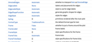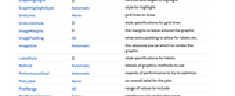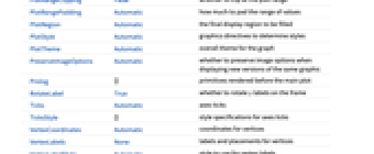 AlignmentPoint Center the default point in the graphic to align with AspectRatio Automatic ratio of height to width Axes False whether to draw axes AxesLabel None axes labels AxesOrigin Automatic where axes should cross AxesStyle {} style specifications for the axes Background None background color for the plot BaselinePosition Automatic how to align with a surrounding text baseline BaseStyle {} base style specifications for the graphic ContentSelectable Automatic whether to allow contents to be selected CoordinatesToolOptions Automatic detailed behavior of the coordinates tool DataRange Automatic the range of vertex coordinates to generate DirectedEdges Automatic whether to interpret Rule as DirectedEdge EdgeLabels None labels and placements for edges EdgeLabelStyle Automatic style to use for edge labels EdgeShapeFunction Automatic generate graphic shapes for edges EdgeStyle Automatic styles for edges Epilog {} primitives rendered after the main plot FormatType TraditionalForm the default format type for text Frame False whether to put a frame around the plot FrameLabel None frame labels FrameStyle {} style specifications for the frame FrameTicks Automatic frame ticks FrameTicksStyle {} style specifications for frame ticks GraphHighlight {} vertices and edges to highlight GraphHighlightStyle Automatic style for highlight GridLines None grid lines to draw GridLinesStyle {} style specifications for grid lines ImageMargins 0. the margins to leave around the graphic ImagePadding All what extra padding to allow for labels etc. ImageSize Automatic the absolute size at which to render the graphic LabelStyle {} style specifications for labels Method Automatic details of graphics methods to use PerformanceGoal Automatic aspects of performance to try to optimize PlotLabel None an overall label for the plot PlotRange All range of values to include PlotRangeClipping False whether to clip at the plot range PlotRangePadding Automatic how much to pad the range of values PlotRegion Automatic the final display region to be filled PlotStyle Automatic graphics directives to determine styles PlotTheme Automatic overall theme for the graph PreserveImageOptions Automatic whether to preserve image options when displaying new versions of the same graphic Prolog {} primitives rendered before the main plot RotateLabel True whether to rotate y labels on the frame Ticks Automatic axes ticks TicksStyle {} style specifications for axes ticks VertexCoordinates Automatic coordinates for vertices VertexLabels None labels and placements for vertices VertexLabelStyle Automatic style to use for vertex labels VertexShape Automatic graphic shape for vertices VertexShapeFunction Automatic generate graphic shapes for vertices VertexSize Automatic size of vertices VertexStyle Automatic styles for vertices