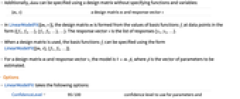 - When a design matrix is used, the basis functions fi can be specified using the form LinearModelFit[{m,v},{f1,f2,…}].