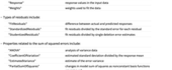 "FitResiduals" difference between actual and predicted responses "StandardizedResiduals" fit residuals divided by the standard error for each residual "StudentizedResiduals" fit residuals divided by single deletion error estimates - Properties related to the sum of squared errors include: