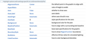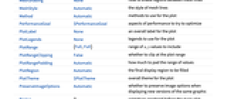 AlignmentPoint Center the default point in the graphic to align with AspectRatio 1 ratio of height to width Axes False whether to draw axes AxesLabel None axes labels AxesOrigin Automatic where axes should cross AxesStyle {} style specifications for the axes Background None background color for the plot BaselinePosition Automatic how to align with a surrounding text baseline BaseStyle {} base style specifications for the graphic BoundaryStyle None how to draw RegionFunction boundaries BoxRatios Automatic effective 3D box ratios for simulated lighting ColorFunction Automatic how to color background densities ColorFunctionScaling True whether to scale arguments to ColorFunction ContentSelectable Automatic whether to allow contents to be selected CoordinatesToolOptions Automatic detailed behavior of the coordinates tool DataRange Automatic the range of x and y values to assume for data Epilog {} primitives rendered after the main plot EvaluationMonitor None expression to evaluate at every function evaluation FormatType TraditionalForm the default format type for text Frame True whether to draw a frame around the plot FrameLabel None frame labels FrameStyle {} style specifications for the frame FrameTicks Automatic frame tick marks FrameTicksStyle {} style specifications for frame ticks GridLines None grid lines to draw GridLinesStyle {} style specifications for grid lines ImageMargins 0. the margins to leave around the graphic ImagePadding All what extra padding to allow for labels etc. ImageSize Automatic the absolute size at which to render the graphic LabelStyle {} style specifications for labels LightingAngle None effective angle for simulated lighting MaxRecursion Automatic the maximum number of recursive subdivisions allowed for the scalar field Mesh None how many mesh lines to draw in the background MeshFunctions {#5&} how to determine the placement of mesh lines MeshShading None how to shade regions between mesh lines MeshStyle Automatic the style of mesh lines Method Automatic methods to use for the plot PerformanceGoal $PerformanceGoal aspects of performance to try to optimize PlotLabel None an overall label for the plot PlotLegends None legends to use for the plot PlotRange {Full,Full} range of x, y values to include PlotRangeClipping False whether to clip at the plot range PlotRangePadding Automatic how much to pad the range of values PlotRegion Automatic the final display region to be filled PlotTheme $PlotTheme overall theme for the plot PreserveImageOptions Automatic whether to preserve image options when displaying new versions of the same graphic Prolog {} primitives rendered before the main plot RegionFunction True& determine what region to include RotateLabel True whether to rotate y labels on the frame ScalingFunctions None how to scale individual coordinates StreamColorFunction Automatic how to color streamlines StreamColorFunctionScaling True whether to scale the argument to StreamColorFunction StreamMarkers Automatic shape to use for streams StreamPoints Automatic determine number, placement, and closeness of streamlines StreamScale Automatic determine sizes and segmenting of individual streamlines StreamStyle Automatic how to draw streamlines Ticks Automatic axes ticks TicksStyle {} style specifications for axes ticks WorkingPrecision MachinePrecision precision to use in internal computations