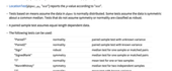 -value according to "test". - Tests based on means assume the data in dspec is normally distributed. Some tests assume the data is symmetric about a common median. Tests that do not assume symmetry or normality are classified as robust.