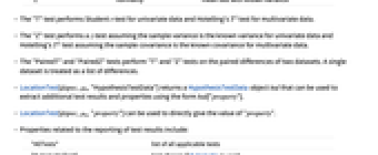 - LocationTest[dspec,μ0,"HypothesisTestData"] returns a HypothesisTestData object htd that can be used to extract additional test results and properties using the form htd["property"].