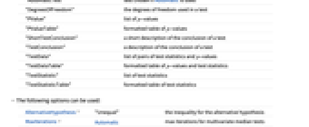 AlternativeHypothesis "Unequal" the inequality for the alternative hypothesis MaxIterations Automatic max iterations for multivariate median tests Method Automatic the method to use for computing