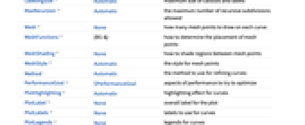 AlignmentPoint Center the default point in the graphic to align with AspectRatio 1/GoldenRatio ratio of height to width Axes True whether to draw axes AxesLabel None axes labels AxesOrigin Automatic where axes should cross AxesStyle {} style specifications for the axes Background None background color for the plot BaselinePosition Automatic how to align with a surrounding text baseline BaseStyle {} base style specifications for the graphic ClippingStyle None what to draw where curves are clipped ColorFunction Automatic how to determine the coloring of curves ColorFunctionScaling True whether to scale arguments to ColorFunction ContentSelectable Automatic whether to allow contents to be selected CoordinatesToolOptions Automatic detailed behavior of the coordinates tool Epilog {} primitives rendered after the main plot EvaluationMonitor None expression to evaluate at every function evaluation Exclusions Automatic points in x to exclude ExclusionsStyle None what to draw at excluded points Filling None filling to insert under each curve FillingStyle Automatic style to use for filling FormatType TraditionalForm the default format type for text Frame False whether to put a frame around the plot FrameLabel None frame labels FrameStyle {} style specifications for the frame FrameTicks Automatic frame ticks FrameTicksStyle {} style specifications for frame ticks GridLines None grid lines to draw GridLinesStyle {} style specifications for grid lines ImageMargins 0. the margins to leave around the graphic ImagePadding All what extra padding to allow for labels etc. ImageSize Automatic the absolute size at which to render the graphic LabelingSize Automatic maximum size of callouts and labels LabelStyle {} style specifications for labels MaxRecursion Automatic the maximum number of recursive subdivisions allowed Mesh None how many mesh points to draw on each curve MeshFunctions {#1&} how to determine the placement of mesh points MeshShading None how to shade regions between mesh points MeshStyle Automatic the style for mesh points Method Automatic the method to use for refining curves PerformanceGoal $PerformanceGoal aspects of performance to try to optimize PlotHighlighting Automatic highlighting effect for curves PlotInteractivity $PlotInteractivity whether to allow interactive elements PlotLabel None overall label for the plot PlotLabels None labels to use for curves PlotLegends None legends for curves PlotPoints Automatic initial number of sample points PlotRange {Full,Automatic} the range of y or other values to include PlotRangeClipping True whether to clip at the plot range PlotRangePadding Automatic how much to pad the range of values PlotRegion Automatic the final display region to be filled PlotStyle Automatic graphics directives to specify the style for each curve PlotTheme $PlotTheme overall theme for the plot PreserveImageOptions Automatic whether to preserve image options when displaying new versions of the same graphic Prolog {} primitives rendered before the main plot RegionFunction (True&) how to determine whether a point should be included RotateLabel True whether to rotate y labels on the frame TargetUnits Automatic units to display in the plot Ticks Automatic axes ticks TicksStyle {} style specifications for axes ticks WorkingPrecision MachinePrecision the precision used in internal computations